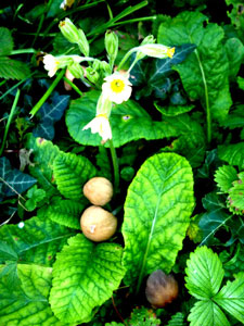 | Im Frühjahr und im Herbst blühen bei mir seit Jahren Schlüssselblumen. Dazu gesellt sich herbstlicher Halimasch-Pilz |