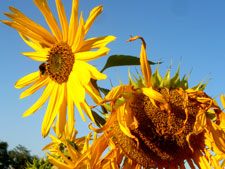| Vor dem angesagten Temperatursturz ernte ich schnell noch bei schönstem Wetter soviel wie möglich. Erste Sonnenblumen werden geköpft, da ich die Kerne u.a. für meine Wildvogel-LiveCam verwende. Somit kommen auch meine lieben "Kleinen" in den Genuss von 100% BIO. |