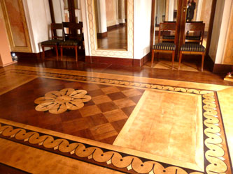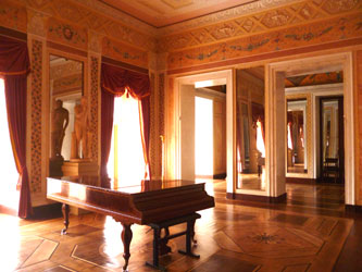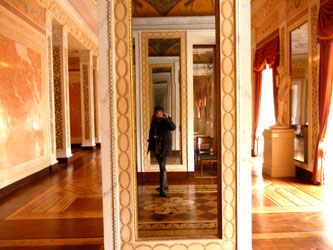 | Ein Saal ist kunstvoller als der andere, die Vielfalt der Details zu erfassen ist unmöglich. So beschränke ich mich mit meinen Fotos auf einen groben Überblick. Neben dem Festsaal ist ein Saal mit einem grossen Flügel, der in einen kleineren mit übermannshohen Spiegelwänden mündet. Auch die Deckendekorationen und Fussböden sind überall bombastisch! |