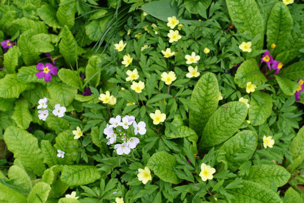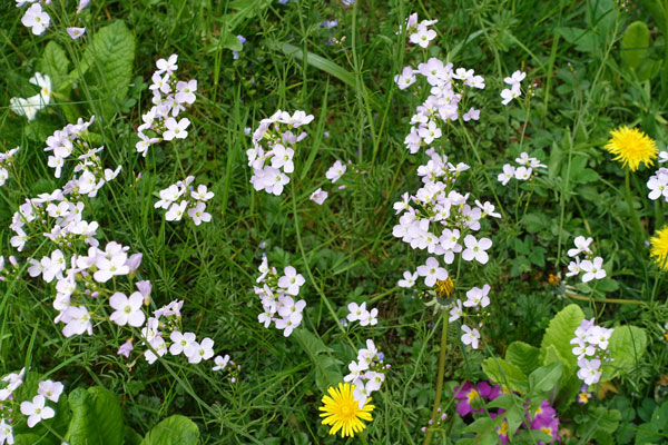 Zartes Wiesenschaumkraut (das ich vor Jahren einpflanzte) und Löwenzahl dominieren nun vor meiner Haustüre.