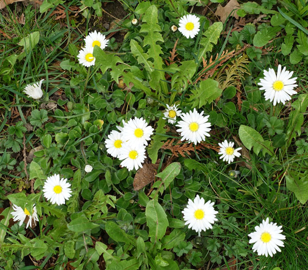 Duftende Veilchen wetteifern mit Gänseblümchen auf dem Weg zur U-Bahn. Beide wachsen getrennt an verschiedenen Stellen.