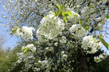 weht, die Vögel zwitschern, Blumen, Bäume und Büsche blühen