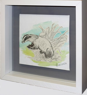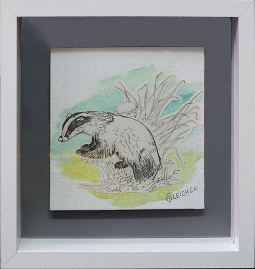 Dachs Jugendarbeit, kolorierte Bleistiftzeichnung-Collage auf Leinwandkarton 24 x 23,5 cm