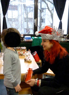 Nikolausmütze mit Glitzer aufgesetzt und den Geschenkkorb gepackt. Als Vertretung