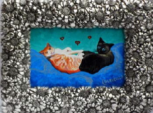 | Die Feiertage sind vorbei und die Zeit vergeht wie im Flug mit Auftragsarbeiten, u.a. für meine beiden italienischen Prinzessinnen. Diesmal soll es kleinformatig sein! Das Wunschmotiv "Jaguar mit Flügel" wird zum "Jaguaro Angelino" und tritt per Post die Reise nach Rom an. Ein kleines Miezekatzenfoto dient mir dagegen als Vorlage für "Artemisia & Garfield", die das schöne Schloss von Cesarina hüten. |