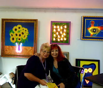 halb den Acryltisch und meine Neonskulptur "Bienenkönig" unter sich. Beim Fallen