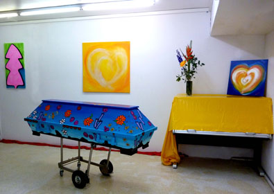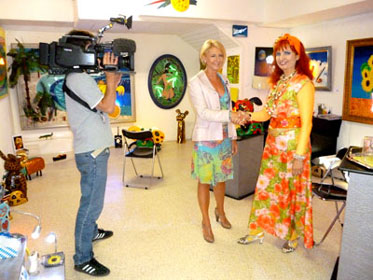 5 Bauarbeiter legen während der Tonaufnahmen jeweils die Arbeit nieder. Anke Dietz, Immobilienmaklerin besucht mich in meiner Open-End-Ausstellung "Lichtvolle Energie" (Müllerstrasse, im Herzen Münchens), um mich und meine Arbeit kennenzulernen, da sie für mich eine passende Luxus-Immobilie zum Mieten finden soll. Ein besonderes "Schmankerl" für das TV-Team ist, dass der vom Bestatter Nuscheler (Peißenberg) in Auftrag gegebene Sarg mit Blumenmotiv "Bienchen-Sarg" noch auf seine Abholung wartet: Es ist der erste Sarg, auf dem sich drei überdimensional große Bienen tummeln. Bin schon sehr gespannt, welche Luxus-Immos mir Anke vorstellen wird! Nachtrag: Video-Ausschnitt zum Schmunzeln... |