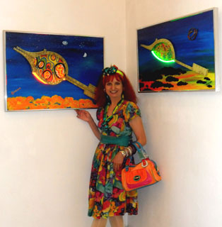 ![]() Beide Neon Bild Objekte "Flying Dragon" (li.) und "Dia de los muertos" mit Original-Flugzeugteilen in Temple Gallery, Rom |