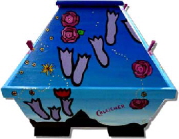 Feinstaub ohne Ende, da kommt Freude auf ... Wirkliche Freude dagegen bereitet mir die Sargbemalung für Bestattung Nuscheler. Der Inhaber, Franz Nuscheler, bringt mir den Rohling persönlich vorbei und beim Gespräch entwickelt sich als Vorgabe für die Bemalung für Peissenberg: "Konservativ mit Blumenmotiv". Selbstverständlich recherchiere ich und stelle fest, dass das Stadtwappen drei Bienen und Bezug zum Bergbau hat. Klar, dass diese Info in meine künstlerische Inspiration einfliesst! |