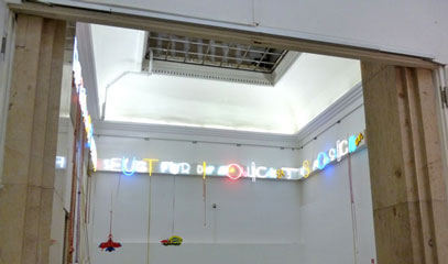 Eingangsbereich der 1. Biennale Münchens buntes Neonlicht! Als ich näher komme,