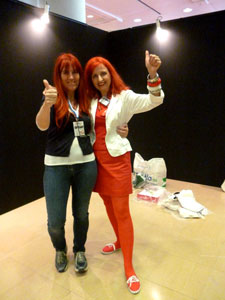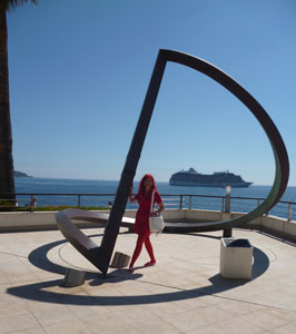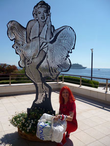 treffen. Gegen 11 Uhr bin ich da, Einlass für "Kunst-Lieferanten", ist jedoch erst ab 14 Uhr... O.K. ...dann mache ich kleine Fototour das Meer entlang zum Strand von Monaco - wohlgemerkt: immer mit Kunst im Handgepäck ("zwischenparken" ist mir zu riskant, denn es könnte ja jemand mein "Packerl" unsanft behandeln?) Endlich weht sanfte Meeresbrise um die Nase und alle Menschen sind gut gelaunt; locker komme ich am Strand von Monaco mit einer charmanten Dame ins Gespräch, die von meinem Red & White Outfit fasziniert ist: Sie trägt eine rote Paillettenjacke im selben Farbton und wir verabreden uns für morgen. Einige Mutige schwimmen bereits im Meer. Zurück zum Bildaufbau - doch: Im "GRIMALDI" gibt es "Künstlerstau", d.h. viel verpackte Kunst und ratlose Gesichter: Wann gibt es Einlass und wieso weiss keiner nix Genaues??? Anstatt wie eine trübe Tasse zu warten, auf zu neuen Ufern! Nach einem Abstecher zum Friedhof von Monaco bin ich zeitlich passend zurück und der Galeriestand ist schnell gefunden, kurze Rast auf dem Fussboden und schon sehe ich meine lieben Galeristen Chantal und Antonio Gallerie Monteoliveto - die Wiedersehensfreude ist gross! |