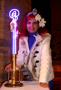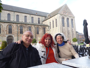 befürchtete er bei Missernten Schlimmes). St. Gertrudis ist die erste Äbtissin in Nivelles und gründete das Kloster Nivelles. Sie war eine frühe Querdenkerin, Großtante von Karl dem Großen und setzte sich für Frauen- und Mädchenbildung ein. Alle Klosterfrauen konnten (für diese Zeit völlig außergewöhnlich) Lesen und Schreiben. St. Gertrudis wird international verehrt, da sie zudem für Reisende, Völkerfreundschaft, Versöhnung, Arme, Sterbende steht. Das Frauenmuseum Bonn ist das einzige Museum in Deutschland mit einer ökumenisch (evangelisch/katholisch) geweihten St. Gertrudis-Kapelle, wo ich meinen eigenen Sarg mit Neoninstallation in der "Göttinnen-Abteilung" im Rahmen der grossen und interessanten Ausstellung "Frauen in den Weltreligionen" (peepart Tagebuch: 24.-26. Juli 2013, 11. Aug., 20. Aug. + 28. Aug. 2013, sowie 10. Nov. 2013) präsentieren durfte. Nochmal ein großes DANKE an die Kuratorin und Direktorin Marianne Pitzen, die mich zur Teilnahme einlud und auch an Curt Delander der mich durch seine hervorragende St. Gertrudis-Kapellenführung im Frauenmuseum begeisterte. Nichtsdestotrotz wundere ich mich über meine St. Gertrudis-Inspiration (peepart Tagebuch: 1. Sept. + 15. Sept. 2014), die nun ins Finale geht! Mit einer kleinen Gruppe fahre ich mit meinem Spezialkoffer mit St. Gertrudis-Neon-Stab im Kleinbus heute früh von Bonn nach Nivelles (Belgien). Nivelles wurde von Deutschen im Krieg 1940 völlig ausgelöscht. 5 Monate danach gab es schon wieder die erste Flur-Prozession, obwohl sie von den Nationalsozialisten unter Waffengewalt verboten wurde. Trotz der Totalzerstörung wirkt das Städtchen durch seine Backsteinbauten inkl. gigantischer Stiftskirche Saint Gertrude historisch. Samstags ist rundherum ein bunter Markt den wir gleich erkunden. Um 15 Uhr trifft sich unsere Gruppe vor dem Hauptportal zu einer höchst interessanten Privatführung; der bekannte Michell Ciemniac zeigt uns die Urkirche und Begräbnisstätten der karolingischen Verwandtschaft unter dem Kirchenschiff sowie wertvolle Kirchenschätze "oben". Im anschliessenden Hochamt - dekoriert wie eine Theateraufführung, u.a. mit mittelalterlich gekleideten Lanzenträgern - wird der von mir gearbeitete St. Gertrudis-Stab mit Neon durch Dechant Albert-Marie Demoitié gesegnet. Dass mein Stab direkt neben einer goldfarbenen St. Gertrudis-Figur platziert wird und diese durch rot-blaues Neon in lila Licht taucht ist selbst für mich überraschend! Danach nimmt uns das Wattenscheider Komitee St. Gertrud mit zu einer privaten Feier der Niveller Gertrudis Freunde. |