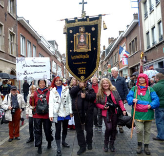 ![]() Frauenmuseum Bonn-Gruppe: St. Gertrudiskapellen-Fahne mit Curt Delander als Fahnenträger und Chris Bleicher (hinten) |