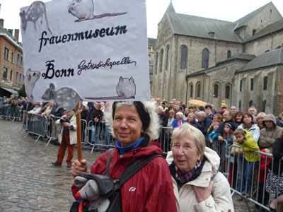 ![]() Nach gelungener Prozession: Carola Beneke mit Hildegard Walbröl und St. Gertrudis-Mäuschen vor der Stiftskirche St. Gertrud zu Nivelles. |