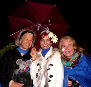 ![]() Carola Beneke, Chris Bleicher und Lene Pampolha frühmorgens bei der St. Gertrudis-Prozession auf dem Weg zum Acker |