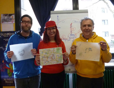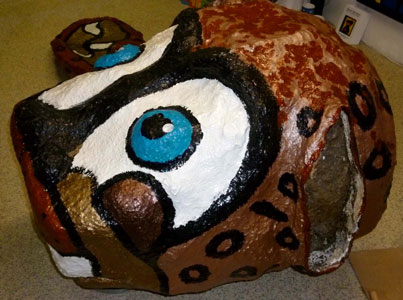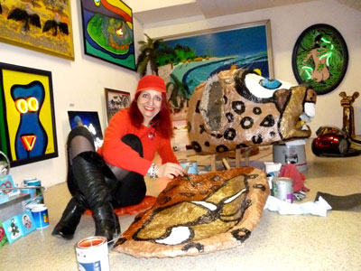der die 6-10jährigen durchaus fordert. Den ersten Test in Form einer Hausaufgabe meisterten sie zu unser aller Erstaunen bestens: Vier Kindergruppen spazierten vom Münchner Marienplatz (= Stadtzentrum) in alle vier Himmelsrichtungen. Dabei sollten Sie sich markante Gebäude/Geschäfte merken und deren Namen notieren. Wieder im Kinderhort, pausten sie den Altstadtring vom Stadtplan mittels Pausenbrotpapier ab und trugen alles notierte - sogar richtig - darauf ein, klasse Leistung! Letztes Jahr im Dezember wünschte ich mir eine Idee für ein Ganzjahres-Projekt mit den lieben Kleinen - und siehe da: Beim Gespräch mit Erzieher Martin stand plötzlich die Idee im Raum, siehe peepart-Tagebuch 21. Januar. Sie dürfen gespannt sein, wie es weiter geht - zur Nachahmung empfohlen! Nach dem schönen Kinderhortbesuch schwebe ich auf Wolke 8 in meinen Ausstellungsraum, wo mein zerlegter Riesenjaguar (RJ) auf Überarbeitung wartet. Normalerweise nutze ich diese Räumlichkeiten NICHT als Atelier. Wegen des praktischen Lastenaufzuges sind jedoch Sargbemalung (siehe peepart-Tagebuch 28. August 14) sowie der überbreite "Koloss", der durch keine normale Türe passt, eine Ausnahme. Es wartet viel Arbeit auf mich, doch im RJ steckt soviel positive Energie, dass ich mich schon auf das fertige Ergebnis freue. Heute erhalten die RJ-Ohrwaschel ein erstes Make-up! |