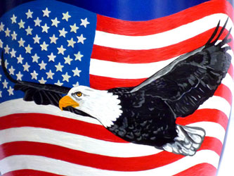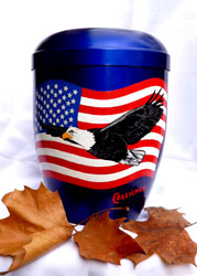 ein: Es ist eine BIO-Urne mit Vorgabe: Fliegender Weisskopf-Adler vor US-Flagge! |