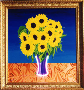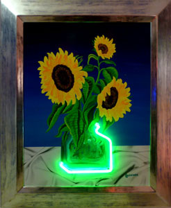 ![]() Chris Bleicher: "Sonnenblumen mit Vase" Mischtechnik, u.a. mit violetter Neoninstallation, 118 x 108 cm |
