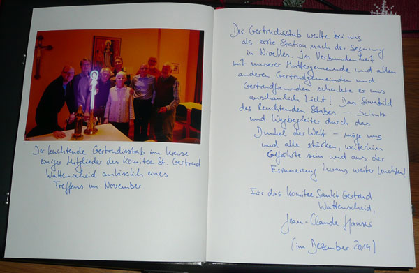 Gertrudis-Buch, Zitatanfang: "Der St. Gertrudis-Stab weilte bei uns als erste Station nach der Segnung in Nivelles. In Verbundenheit mit unserer Muttergemeinde und allen anderen Gertrudgemeinden und Gertrudfreunden schenkte er uns anschaulich Licht! Das Sinnbild des leuchtenden Stabes - Schutz und Wegbegleiter durch das Dunkel der Welt - möge uns und alle stärken, weiterhin Gefährte sein und aus der Erinnerung heraus weiter leuchten!" Zitatende Weihbischof Ansgar Puff besuchte am 12. März 2016 die St. Gertrudis Kapelle im Frauenmuseum Bonn, Curt Delander Zitatanfang: "Weihbischof Ansgar Puff war hellauf begeistert von der modernen Version dieses Stabes und der Inschrift!" FRIEDE LICHT LIEBE VERSÖHNUNG: Mögen diese weltweit bei den Menschen Einzug halten! Auf dem Foto leuchtet der Neonstab hinter Marianne Pitzen, Direktorin Frauenmuseum Bonn, siehe Veröffentlichung "Sogar Wikipedia kennt unsere Gertrudis": Bonn Express v. 18.12.2015 |