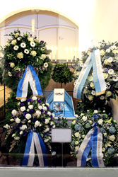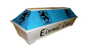 Bleicher-Erdmöbel mit 1860er- Logo - seinem Lieblingsverein - in Frage kommt! Nach der schriftlichen Genehmigung des Fussballvereins bzgl. Logo machte ich mich mit viel LIEBE ans Werk mit der Vorgabe: Text auf Unterbau "Einmal Löwe - immer Löwe", Deckel bayerisch-weiss-blau, 6 x 1860er-Logo. Die Bemalung erfolgte in meinen Ausstellungsräumen, da ich dort einen Lastenaufzug habe. Mit freundlicher Genehmigung der Hinterbliebenen darf ich auch die Fotos der traurig-schönen Beerdigung für mein peepart Tagebuch verwenden - danke! Sargfotos hier