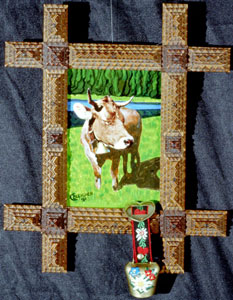 ![]() Die Kühe auf der Weide erinnern mich an meine "Alpen-Idylle" aus meiner bayerischen Serie, die ich vor vielen Jahren malte/collagierte, u.a. mit 3D-Kuh im Vordergrund |