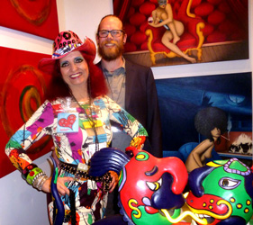 Happy mit Neonskulptur THE JAGUAR'S LOVE