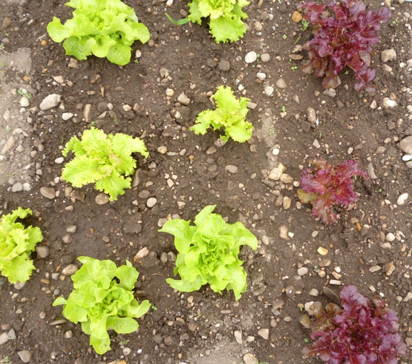 Salatpflänzchen - die dunklen sind Eichenlaub-Salat |