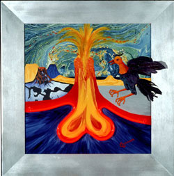 das plötzliche Erwachen der Supervulkane an. Der Phoenix (mit echten Federn) steht für Unsterblichkeit,