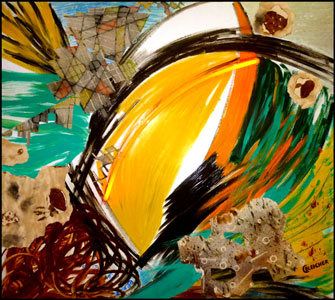 Hurrikan eine Anspielung auf die in Aufruhr geratene Natur: Mischtechnik, u.a. mit oranger Neon-Installation,