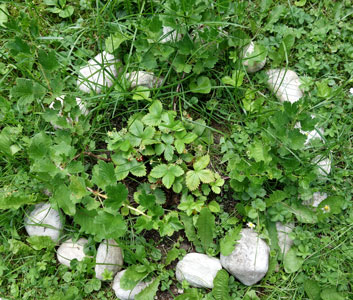 | Von meiner lieben Freundin Irmi bekomme ich einen Stachelbeer-Busch geschenkt, für den ich ein schönes Plätzchen direkt 2 m vor meiner Haustüre aussuche. Nach dem Einbudeln schnell noch ein paar hübsche Isar-Steine drumherumgelegt, damit er vor dem Rasenmäher des Hausmeisters geschützt bleibt. Zarte, weisse Erdbeer-Blütchen sind auch noch mit dabei, wunderbar! |