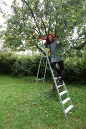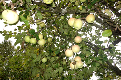 Es ist eine liebliche, dörfliche Gegend mit Hügelchen. Wir ernten alte Apfelsorten, die