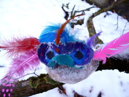 ![]() Gebastelte Vogelmaske meiner lieben Kleinen auf Krapfen in Astgestänge |