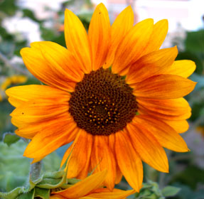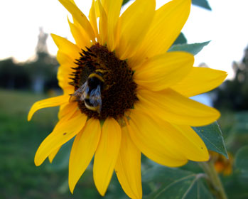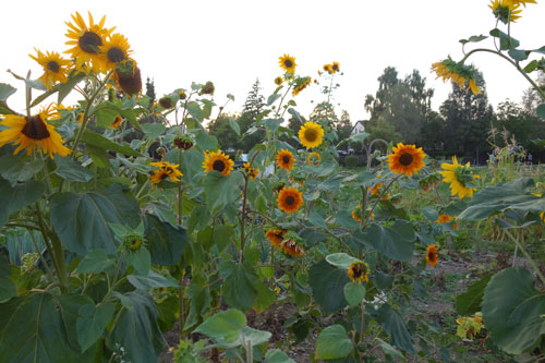 | Aus den wenigen gepflanzten Sonnenblumen wurde ein kleiner Wald; immer wieder schnitt ich verblühte Sonnenblumen ab, um die Kerne auszupuhlen als BIO-Vogelfutter für meine "lieben Kleinen". Auch Bienchen & Hummelchen schwirren fleissig von Blüte zu Blüte! |