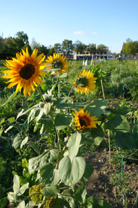 | Ernte heute von meiner Krautacker-Parzelle: Mangold, Petersilie, Schnittlauch und Kohlrabi. Zu meiner Überraschung fielen mir erste Kartoffel buchstäblich entgegen. Meine Sonnenblumen entwickeln sich prächtig und blaue, zarte Schwarzkümmel-Blüten erfreuen mein Herz, obwohl ich sie NICHT pflanzte: |
