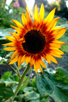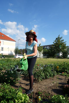 | Wasser in Giesskannen pumpen und 30 m² giessen verbuche ich unter "Sport". Es ist eine Freude, alles wachsen und gedeihen zu sehen, sodass ich täglich wirklich BIO geniesse. Eine erste Sonnenblume blüht auch schon! |