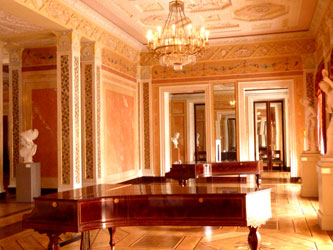 | Ein Saal ist kunstvoller als der andere, die Vielfalt der Details zu erfassen ist unmöglich. So beschränke ich mich mit meinen Fotos auf einen groben Überblick. Neben dem Festsaal ist ein Saal mit einem grossen Flügel, der in einen kleineren mit übermannshohen Spiegelwänden mündet. Auch die Deckendekorationen und Fussböden sind überall bombastisch! |