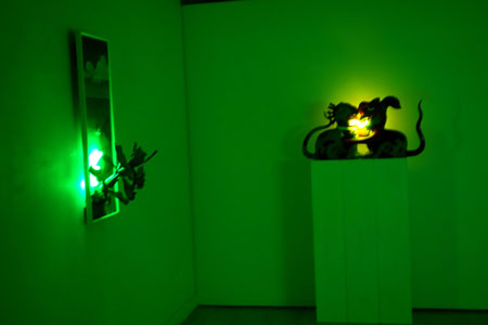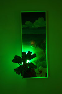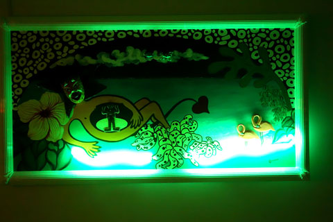 | Nach der Vernissage schaltet Galerist Serge die Galerie-Lichter aus, sodass nur meine Neon Art leuchtet, als ob kleine Grüne Männchen hier Tango tanzen würden! Dies ist insbesondere bedingt durch die grünen Neon-Installationen von "Island Princess" und "The Devil Rests in Paradise". Meine Neon Art-SammlerInnen wissen, dass sich meine Kunstwerke - je nachdem, ob sie im Tageslicht oder nachts leuchten, verändern: Tags steht das Gemälde im Vordergrund, nachts der 3D-Effekt von dreidimensionalen Collagen etc. Happy düse ich am nächsten Tag nach Cancún und gönne mir dort schöne Urlaubstage. |