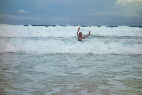 legt für mich den für morgen zur Isla Mujeres Dass es regnet, ist wunderbar, so kann ich guten Gewissens weiter mein peepart Tagebuch programmieren. Doch bereits um 14 h klart es auf, sodass ich eine Pause einlege mit Riesen-Badespass: Der Strand ist fast menschenleer, die Sonne kommt hinter Wolken hervor und die wenigen Badegäste kann man an einer Hand abzählen. Ich geniesse das Spiel mit den Wellen und hoffe, dass Fukushima - leider ein Fass ohne Boden, das in den Medien totgeschwiegen wird - mich gnädig von "strahlendem Meerwasser" verschont. Wellenspass als Arbeitspause hätte ich auch in München... |