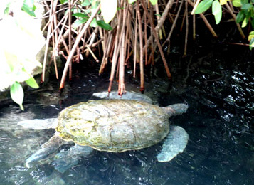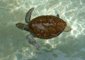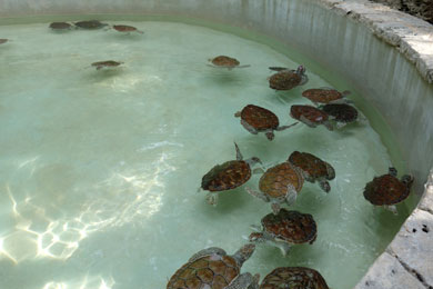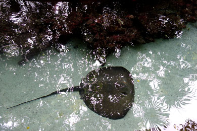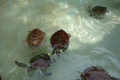 | Open air tummeln sich - getrennt nach Spezies - Haifische, Rochen & Wasserschildkröten. Die grossen Exemplare schwimmen bedächtig und sind beeindruckend während die kleineren Schildkröten quirlig hin- und herpaddeln. |