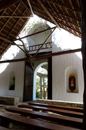 | Gleich neben den bunten mexikanischen Grabstätten gelange ich wie von selbst in eine kleine open air Kapelle, d.h. sie ist nur mit schöner Palmblattdach-Konstruktion, jedoch ohne Wände. Das ist sicher angenehm für Gläubige bei heissen Temperaturen. |
