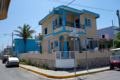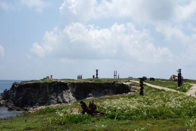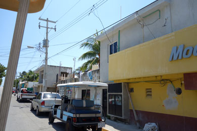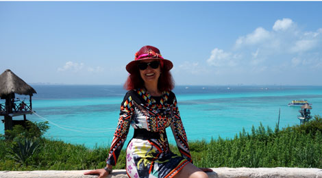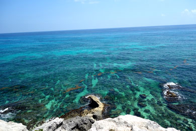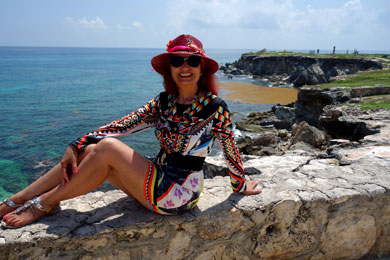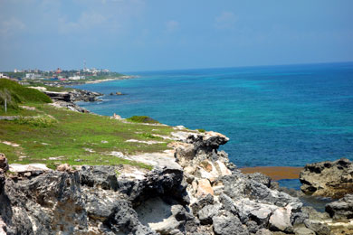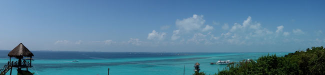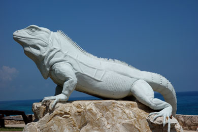 | Die Insel ist nur ca. 500 m breit und 7,5 km lang. Obwohl lt. Reiseführer der September zu den regenreichsten Monaten gehört, habe ich wie immer Glück mit dem Wetter! Dies trotz Hurrikan-Zeit, die von Juni bis November geht. Deshalb sehe ich auch hier keine europäischen Touris, nur wenige Mexikaner. Es gibt viele Attraktionen, angefangen von Schwimmen mit Walhaien bis zum Skulpturengarten an der Punta Sur. Ich entscheide mich für eine Rundfahrt mit einem Golf Cart, zusammen mit einem Pärchen und der Fahrerin sind wir zu viert. |