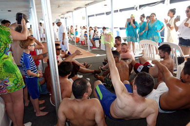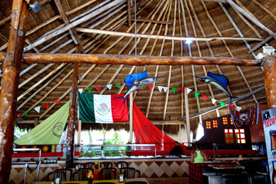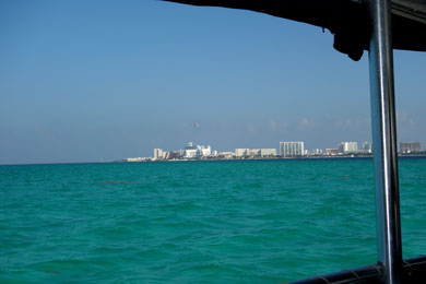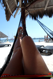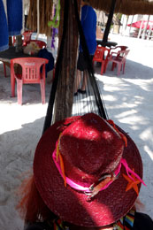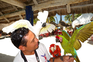 | Nach der kleinen Rundfahrt zurück am Strand sehe ich einen Mann mit drei wunderschönen Papageien. Wer mich kennt, weiss, dass ich DON PEDRO, einen roten ARA-Papagei, als gefiederten Freund gewinnen konnte und sogar ein aussergewöhnliches Foto Shooting mit ihm machte. Als ob das der Mexikaner geahnt hätte, kommt er auf mich zu und ich freue mich über das obligatorische Papageien-Touri-Foto! Mexikanisches Mittagessen und danach Seele baumeln lassen am Strand, am besten in einer Hängematte, bis die Bootsfahrt zurück nach Cancún geht. |