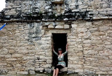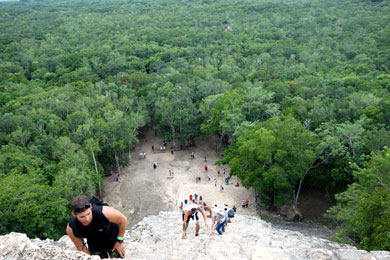 | Nohoch Mul ist die höchste Pyramide auf Yukatan. Mittlerweile nieselt es leicht, doch das hält mich und die wenigen Touris nicht davon ab, die Stufen zum Gipfel der Pyramide hochzuklettern. Sie sind unregelmässig, wie beim Bergsteigen geht es steil nach oben. Gut, dass noch Hurrikan-Saison ist, denn in der Hauptsaison werden sich hier vermutlich die Touris beim Hochkraxeln auf die Fingerspitzen treten. Der Ausblick auf den wolkenverhangenen Urwald ist phänomenal! Die Regentröpferl sind angenehm warm; wie eine Gams (= Gemse) laufe ich zickzack nach unten, so geht der Abstieg rascher als der Aufstieg. |