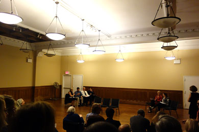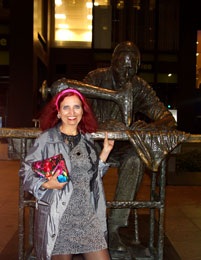 | Kleine Verschnaufpause im Hotel, dann mit dem Q-Zug Uptown East zur Triangle Theatre Company at the Church of the Holy Trinity, wo ein "Staged Reading of Forty Carats" aufgeführt wird. Ich komme gerade rechtzeitig in der Pause an, sodass mein Zuspätkommen unbemerkt bleibt. Mein lieber Freund Eric Kuzmuk ist einer der Schauspieler und ich freue mich sehr, ihn nach langer Zeit wieder zu sehen! Das nächtliche New York fasziniert wie immer. |