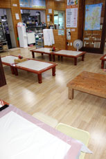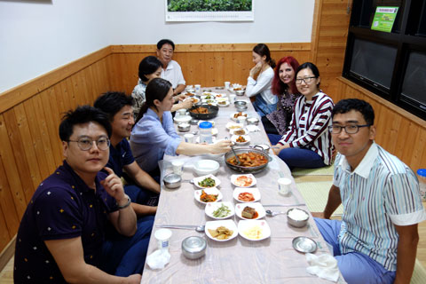 sodass sie übersetzen können. Wegen meiner Neoninstallation kam ich bereits zwei Tage früher an und komme so in den Genuss, vom Museumsdirektor Cheon Eob YU und seiner Frau Kyung Myung Ta und den MuseumskuratorInnen jeweils zum gemeinsamen Abendessen mit den KuratorInnen ins Stammlokal eingeladen zu sein. Es ist unbeschreiblich, wie man sich hier um mein Wohl bemüht! Ach ja: Im Stammlokal sieht es etwas anders aus als in bayerischen Wirtshäusern: KEINE Stühle! Man zieht die Schuhe im Vorraum aus und sitzt am Boden auf Sitzmatten an niedrigen Tischen. Es gibt immer mehrere Schälchen mit verschiedensten Speisen. Dass ich vegetarisch KEIN Fisch, KEIN Fleisch esse, darauf wird rührend Rücksicht genommen. Heute Abend bekomme ich deshalb das koreanische Nationalgericht Kom Chi - eine sehr heisse Suppe mit Kohl mit Seidentofu, pikant gewürzt. Hinterher wäre ich noch zum Tee eingeladen gewesen, doch ich sage NICHT nein, denn NEIN gibt es in Südkorea NICHT, sondern lasse es offen was besser ist und entscheide mich dann für mein peepart Tagebuch schreiben, wofür man Verständnis hat, denn die Museumsleute haben sicher vor so einer wichtigen Veranstaltung etwas anderes zu tun als mich zu bespassen (denke ich, keine Ahnung, ob das so ist?). Ach ja, in meiner super location wurde mir auch noch - zusätzlich zu den Essenseinladungen - der Kühlschrank (vegetarisch) aufgefüllt - keine Ahnung wer das alles essen soll? Ablehnen geht ja nicht, siehe oben... |