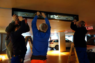 ![]() Hauselektriker und Montagemänner, die den Kasten vorsichtig auspacken