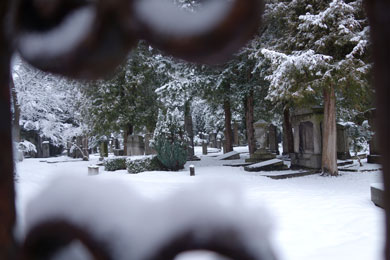 tragen. Auf dem Weg zur U-Bahn sehe ich durchs Gitter des Jüdischen Friedhofs in der Thalkirchner Strasse (München)