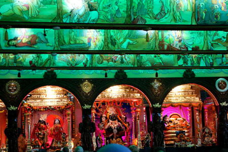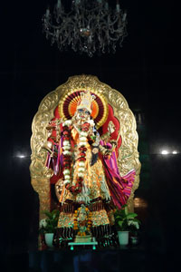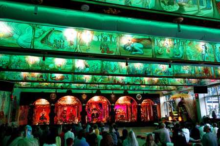 | Im Juni 2018 wurde der neue Tempel im Bhakti Marga Zentrum eingeweiht, ich bin sehr gespannt wie er aussieht: Unter der Decke sind Szenen aus dem Leben Krishnas sowie die zehn wichtigsten Inkarnationen Vishnus. Wandmalereien zeigen Mahavatar Babaji und hinduistische Heilige. Der Altarbereich ist noch verhüllt, als ich ihn betrete. Erst später sehe ich die Hauptgottheiten, denen Opfergaben dargebracht werden. Würde ich nicht wissen, dass ich in Swamis Vishwanandas Ashram in Heidenrod-Springen bin, hätte ich das Gefühl, irgendwo in Indien zu sein. Es gibt auch eine christlich-orthodoxe Kirche, die ich diesmal nicht besuche. |