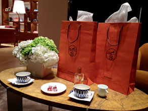![]() Mit Kaffee, Schoko und Hermès-Tüten relaxen wir im Hermès-Salon |
