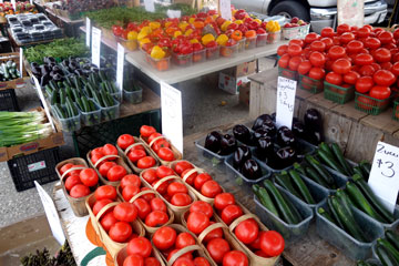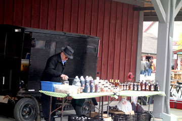 | St. Jacobs liegt ca. 150 km von Toronto entfernt. Der Farmers Markt findet 2 x wöchentlich statt. Die Mennoniten (viele kamen aus Deutschland und der Schweiz) sind Selbstversorger, d.h. sie betreiben Ackerbau und Viehzucht. Die Frauen tragen schwarze Häubchen, die Männer Hüte - sie lassen sich ungern fotografieren! Trotzdem gelangen mir ein paar Schnappschüsse. |